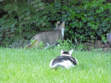 Meanwhile, Bibs and Lickety were stalking something out back by the back property line: