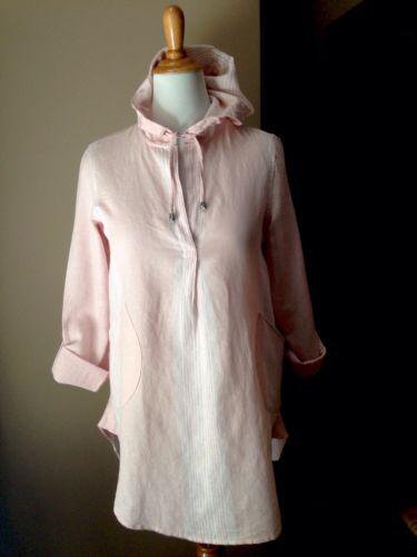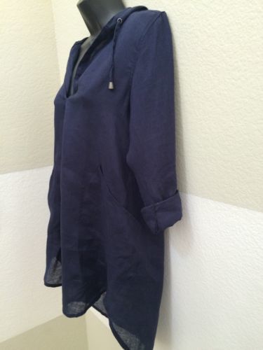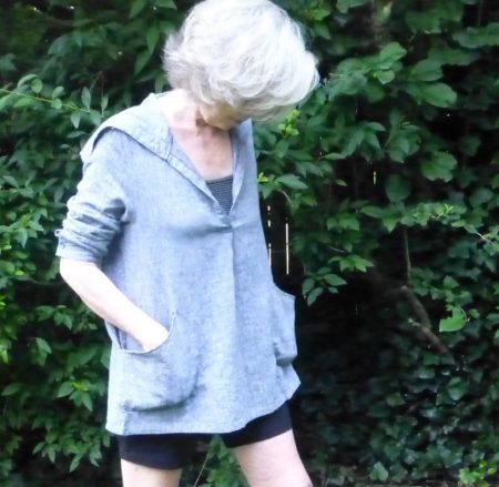 Well, to be honest, I did’t find this particular piece; I found one like it in grey linen that I didn’t take a photo of. Because this is it BEFORE, when it had a draw-string hoodie (nobody my age should wear a hoodie, I’m just saying) and it had a button thing on the sleeve that let you roll it up, and it had very long shirt tails in the front and back that made it look almost like a dress.