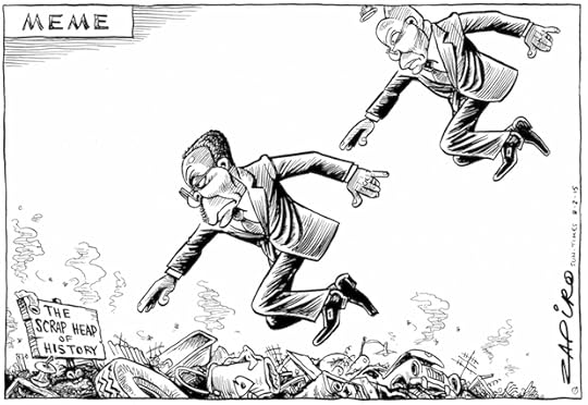 Zimbabwe's 90-year-old President Robert Mugabe fell down a staircase as he walked off a podium after addressing supporters at Harare International Airport. Never to miss a chance for a bit of humour, internet users turned his tumble into a series of memes. A meme is defined as an element of a culture or system of behaviour passed from one individual to another by imitation. In this cartoon Jacob Zuma is copying Zimbabwean president Robert Mugabe.