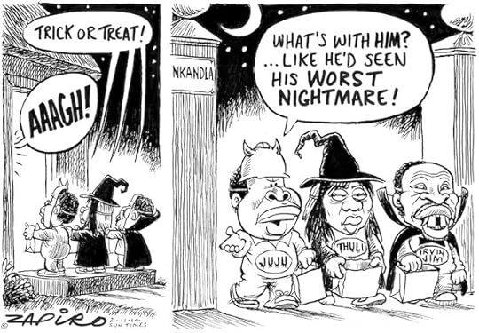 Trick-or-treating is a customary practice for children on Halloween in many countries. Children in costumes travel from house to house in order to ask for treats such as candy (or, in some cultures, money) with the phrase "Trick or treat!" The "trick" is a (usually idle) threat to perform mischief on the homeowners or their property if no treat is given to them. The children in the cartoon is the Public Protector, Thuli Madonsela, NUMSA Secretary-General, Irwin Jim and Julius Malema, founder leader of EFF. All three have been making Jacob Zuma's life difficult.