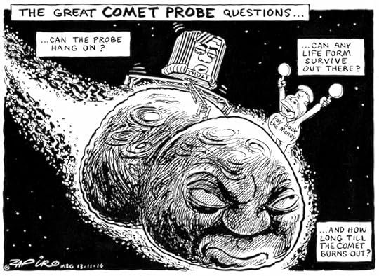 Launched on 2 March 2004 on an Ariane 5 rocket, Rosetta landed this week (12 November 2014) on the the 67P/Churyumov–Gerasimenko (67P) comet. Rosetta is a robotic space probe built and launched by the European Space Agency to perform a detailed study with both an orbiter, and lander module Philae. Zapiro has drawn a South African version.