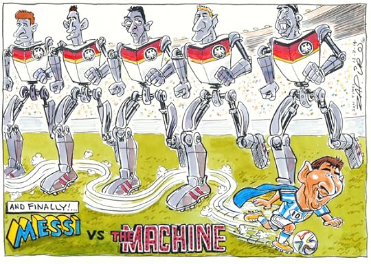 The 2014 Fifa World Cup final (Germany vs Argentina) will take place on (13th Jul 2014) in front of an expected television audience of more than a billion. On the one side there is Lionel Messi, whose deadly combination of speed, skill and finishing prowess is unrivaled. On the otherside there is a team of players that behave like a machine. Germany thrashed Brazil 7-1 in the semi final. It is appropriate that the final is being billed "Messi vs. the machine."