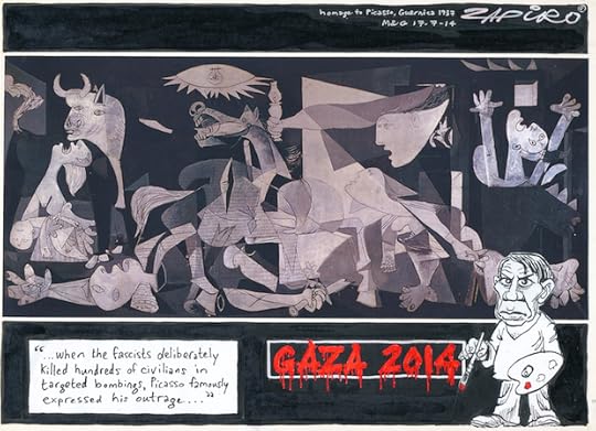Zapiro's cartoon is based on Pablo Picasso's Guernica, one of the most famous paintings of all timep ainted in 1937. Probably Picasso's most famous work, Guernica is certainly the his most powerful political statement, painted as an immediate reaction to the Nazi's devastating casual bombing practice on the Basque town of Guernica during Spanish Civil War. Picasso’s Guernica has become a universal anti-war symbol. On 26 April 1937, Franco’s allies, Nazi Germany and Fascist Italy, sent the Luftwaffe and Aviazione Legionaria to bomb the Basque town of Guernica on market day. ‘The bombing has often been considered one of the first raids in the history of modern military aviation on a defenseless civilian population. Taking this 77 years on, Israel’s terror bombings of Gaza mirror Göring’s callous military intentions. Civilians are bearing the brunt of Israel’s attack on the Gaza Strip, with civilians accounting for more than 80 percent of the reported casualties