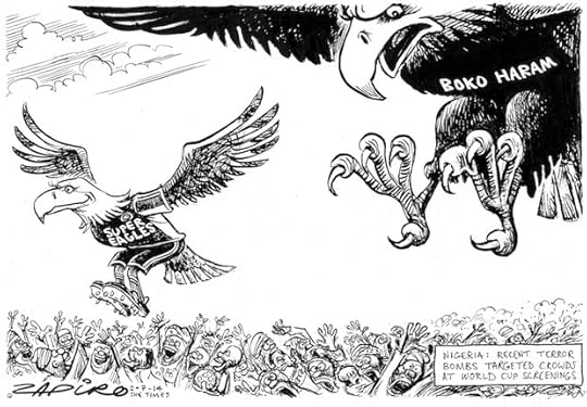The news of Boko Haram's latest bombings take over the headlines at the same time as the Super Eagles play a superb game against France at the 2014 FIFA World Cup. Gutsy Nigeria put in a brave performance and made their country proud. The Super Eagles had their chances in a terrific match that entertained from start to finish, but were undone in the final 11 minutes as the French grabbed a pair of late goals. Nigeria thought they should have had a penalty just before the break as French defender Patrice Evra clearly impeded Odemwingie, but none of the match officials appeared to see what was in plain sight for most of the ground. Boko Haram extremists are accused of a series of recent bomb attacks in the West African nation. Explosions in the previous week targeted were : a) The biggest shopping mall in Abuja, Nigeria's central capital, killing 24 people, A medical college in northern Kano city, killing at least eight and Aotel brothel in northeast Bauchi city that killing 10. The latest bombong was the third bomb blast in as many months in Abuja, and the second in two months in Kano. In May, twin car bombs at a marketplace also left more than 130 dead in central Jos city and killed at least 14 people at a World Cup viewing site in Damaturu, another town in the northeast.