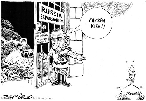 Russia is flexing its muscles in Ukraine, its large and strategically important neighbour, sparking wide-ranging concerns within Europe from Russian expansionism to energy security. Russia looks at Ukraine in the same way that China looks at Taiwan: as an existential issue in which lines must not be crossed. Zapiro uses the Russian bear and and Chicken Kiev to symbolise the situation. The Russian Bear is a widespread symbol for Russia, used in cartoons, articles and dramatic plays since as early as the 17th century, and relating alike to Tsarist Russia, the Soviet Union and the present-day Russian Federation. In the dying days of the Soviet Union, President George H W Bush gave a speech in Kiev urging Ukrainian nationalists not to provoke Moscow. US conservatives dubbed it his “chicken Kiev” speech.