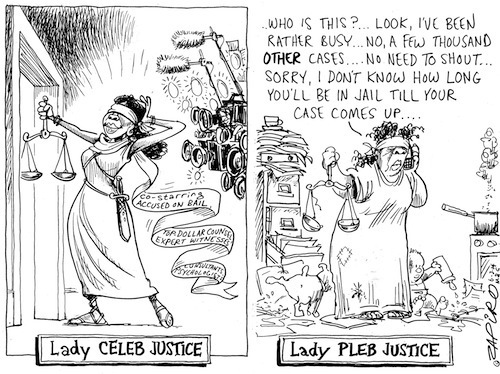 It seems that Some South African trials such as the Pistorius trials get priority, while the majority of cases in South Africa have to wait their time with the accused having to sit in prison without bail. Zapiro's cartoon refers to the Oscar Pistorius trial. South Africa's biggest trial since apartheid puts a celebrity sportstar in the dock for the murder of his model girlfriend. But the cream of the country's legal system are also in the spotlight.Oscar Pistorius has hired a "dream team" .