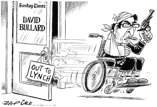 Sunday Times journalist David Bullard was shot and wounded when four men broke into his Johannesburg house. Bullard, 55, had been shot once with the bullet going through his arm and into his abdomen. The four men had gained access to his house in Parkview through a bedroom window. While details are sketchy it appears that Bullard's wife was taken up to the bedroom by one of the robbers when a shot went off. The four men then fled though the same window, taking a handbag and cellphone with them. Bullard, who writes column in the Sunday Times, was reported to be in a stable condition. Bullard is known for his "Out to Lunch" column in The Sunday Times newspaper. It is thought to be one of the most widely read columns published in the country, at least in part because of Bullard's habit of insulting and infuriating the rich and famous.[
