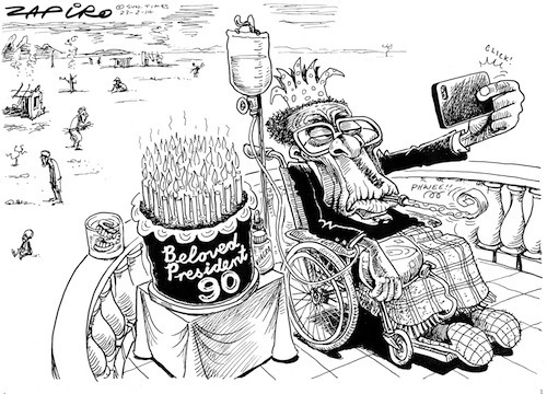 Thousands of people turned out to wish happy birthday to Zimbabwe's president, Robert Mugabe, who threw 90 balloons into the air to mark his 90th year and continuing hold on power. Fresh off the plane from Singapore, where he had travelled for eye surgery the previous week, Mugabe was in typically defiant mood as he launched the celebrations at Marondera stadium, east of the capital, Harare. He said: "I feel as youthful and energetic as a boy of nine." Mugabe's birthday celebration has cost over $1-million but is being criticesed at a time of job losses and slowing economic growth.