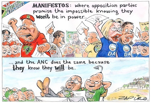 Manifestos from the varioius political parties in South Africa. Election manifestos are promises; in many elections, the party with the best promises wins. But there's a caveat: those promises and aspirations should somehow be connected with reality. In South African context, no-one should promise a tender for every home, and get away with it. But you can certainly make people hope and dream. And then get them to vote for you. The ANC's 2014 election manifesto as an interesting mix of all of this, with plenty of spice to make the recipe more appetising - Stephen Grootes
