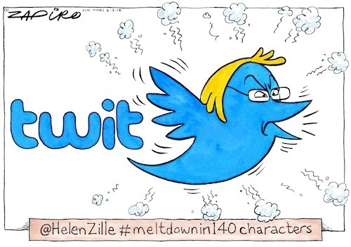 The socially media savvy leader Helen Zille tweets regularly and has had a few memorable spats in the past. But it's been a while since she's really let rip until Sunday (23/2/2014). She launched a surprisingly vitriolic attack on City Press political journalist Carien du Plessis. Helen Zille sent a flurry of tweets to her more than 380 000 Twitter followers. The outbursts from Helen Zille shows that she is a compulsive tweeter who gives little thought to the impact of her public rants — Has Zille misunderstood the meaning of freedom of press? After these run-ins with the media over these tweets, some members of her DA party are questioning her leadership.