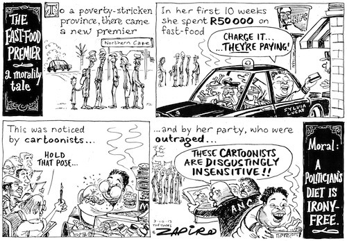 ANC unhappy at how Northern Cape Premier Sylvia Lucas was being ridiculed by cartoonists for allegedly abusing her government credit card on chicken buckets, fast food and groceries. Sunday Times reported that Lucas used her official credit card to spend R53,159 on fast-food during her first 10 weeks in office.