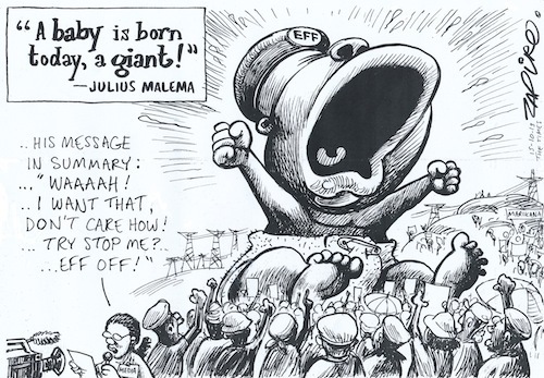 EFF is a new political party launched by ex ANCYL leader Julius Malema. Hundreds of EFF members gathered on top of a hill at Nkaneng informal settlement in Marikana, the site of last year’s massacre, just outside Rustenburg on Sunday for the official launch of the EFF. In a predictable text, Malema told thousands of supporters in Marikana that if wealth is shared, crime will come down. He appealed to the black middle class to stop being coconuts and come out to fight like warriors.