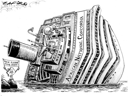 The Costa Concordia, an Italian luxury cruise ship sank on January 12, 2012 and has been lying on its side ever since. until recently when it was successfully righted during a painstaking operation led by South African Nick Sloane. Zapiro's cartoon compares the sunken ship to present day ANC, which is in need of righting itself. The ANC is deeply in need of redemption and resurrection as it suffers from disorganisation, lack of leadership and corruption.