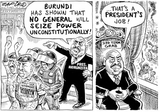 While President Pierre Nkurunziza was stuck in Dar es Salaam tweeting up a storm, his former intelligence chief powerful General Godefroid Niyombare launched a coup, in a culmination of weeks of violent street protests against the president's bid to seek a third term. Many welcomed the coup, celebrating in the streets of Bujumbura. Hundreds of people in Burundi have protested in the capital Bujumbura after the country&'s ruling party nominated President Pierre Nkurunziza to run for a third term. Burundi’s constitution stipulates that a president can only serve for two terms, but Nkurunziza’s party says he is eligible for another term as popularly elected president because for his first term he was elected by lawmakers. Critics say this is not a proper interpretation of the law and that he should not get a third term. A former rebel leader, Mr Nkurunziza took office in 2005 following the end of a 12-year conflict, which killed more than 300,000 people. He was re-elected in June 2010 but the vote was boycotted by the opposition, which complained of fraud in the earlier local elections. Opposition leaders and international observers have since complained of a growing crackdown on opposition parties and the media.