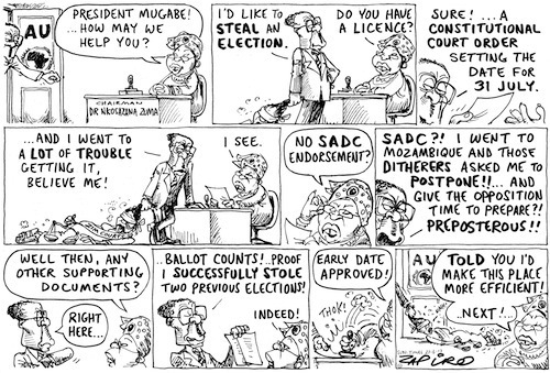 President Robert Mugabe unilaterally announced July 31 as the date for Zimbabwe’s next national election, placing him at loggerheads with Prime Minister Morgan Tsvangirai, his partner in a shaky four-year-old coalition government. Rather than negotiating with his MDC coalition partners for an election date, President Robert Mugabe is still ruling by decree with a unilateral declaration of the July 31 election date shows. The Zanu (PF) is still using its state-owned propaganda machine to distort information and undermine its partners in the unity government. It is still using the courts to support favoured outcomes. Election registration is encountering delays in urban areas, traditionally a stronghold for the opposition parties. Non-African countries offering observer missions are not being accepted. Zimbabwe's Constitutional Court ordered Mugabe two weeks ago to hold the poll by the end of July, but Prime Minister Morgan Tsvangirai has rejected his rival's declaration, saying it was too early and accusing him of creating a political crisis. African Union Commission Chairwoman Nkosazana Dlamini-Zuma, speaking at a press conference in Geneva, questioned whether it was right to second-guess Zimbabwe's courts. She said "The courts have said the elections must take place. And so do we listen to the courts? Or do we not listen to the courts? I thought a lot of you have always been talking to us about the rule of law and respect for the judiciary," - "So I don't know. The Zimbabweans must sort it out, whether they listen to the judiciary and go with what the judiciary has said, or whether they ignore it."