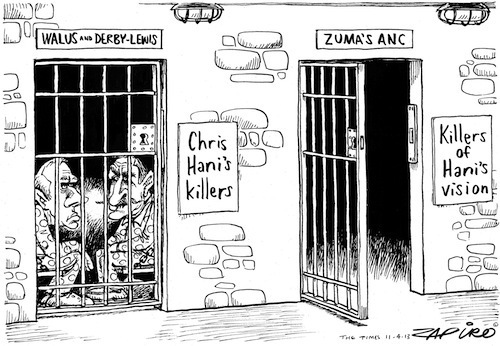 Chris Hani was the leader of the South African Communist Party and chief of staff of Umkhonto we Sizwe, the armed wing of the African National Congress. He was a fierce opponent of the apartheid government. On April 10 1993, he was assisinated outside his home in Boksburg. He was accosted by a Polish far-right immigrant named Janusz Waluś. Clive Derby-Lewis, a senior South African Conservative Party M.P. and Shadow Minister for Economic Affairs at the time, who had lent Waluś his pistol, was also arrested for complicity in Hani's murder. Both are serving life-sentances. According to Zapiro's cartoon Walus and Derby-Lewis may have assassinated Chris Hani but his vision of a fairer South Africa has been killed by the present day ANC leadership.