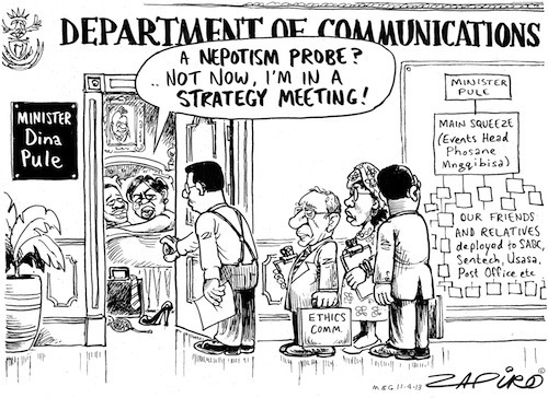 Police have been asked to investigate the Minister of Communications Dina Pule as well as Gugu Duda, chief financial officer at the SA Broadcasting Corporation [SABC]; Phosane Mngqibisa, head of Khemano Events; and Lulama Makhobo, group CEO of the SABC. here are already two investigations in progress. Joint Committee on Ethics and Members' Interests Chairman, Professor Ben Turok, has summonsed Minister Dina Pule to appear at hearing set for 2 and 3 May 2013. This is with regard to a contract awarded to Khemano Events in staging the R102 million ICT Indaba in Cape Town in 2012. Minister Dina Pule is being investigated by the Public Protector, also in connection with the ICT Indaba. Pule has also been accused of nepotism after allegations that her boyfriend Phosane Mngqibisa orchestrated the appointment of friends and family to key organisations under her portfolio.