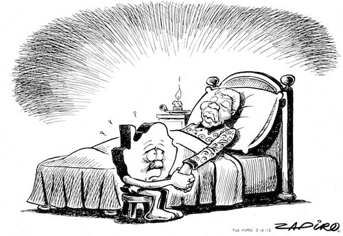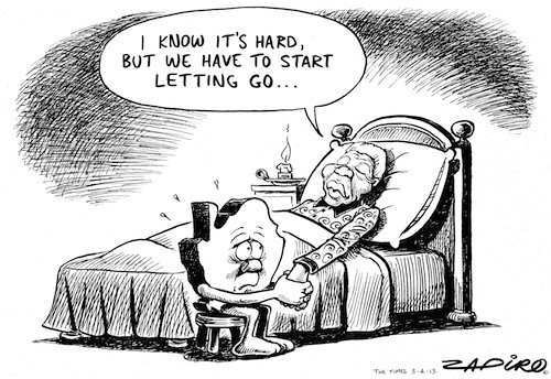 Nelson Mandela aka Madiba is in hospital. Every time he goes to hospital South Africa shudders so much so that the Presidents's office assures everyone that he is doing well. Nevertheless we need to recognise that he is no longer young, that he is not well and is likely to die sooner rather than later. Zapiro drew a powerful cartoon with a speech bubble saying " I know its hard but we have to start letting go". After some thought the editors at The Times thought it better to take the speech bubble away and that one was eventually published.