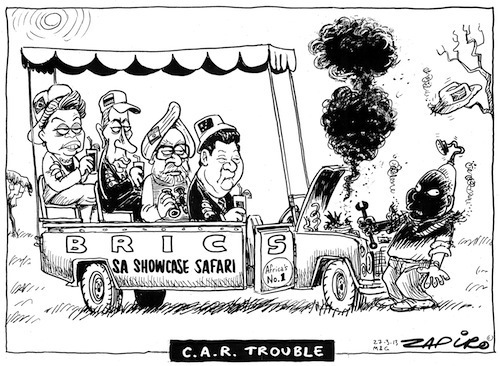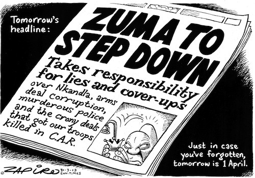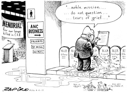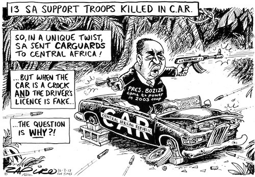 Ousted Central African Republic president Francois Bozize, flees after rebels take the capital Bangui. Zuma said that 13 South African troops had been killed in clashes with the Seleka rebels on the outskirts of Bangui. South Africa's sent a 200-soldier contingent to Central African Republic in January to support the government troops after the rebels launched an offensive in early December. Zuma said "As a member of the African Union, South Africa rejects any efforts to seize power by force." At the same time Zapiro's cartoon notes that Bozize had come to power in a military coup and questions why the 13 SA support troops were killed. The answe to the question is given in the article from the Daily Maverick - CAR fiasco: This is what we get for letting our government prop up a nasty dictatorship.