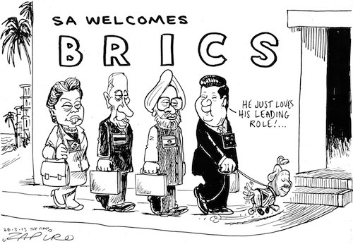 South African President Jacob Zuma proudly hosts Chinese President Xi Jinping, Brazilian President Dilma Rousseff, Russian President Vladimir Putin and Indian Prime Minister Manmohan Singh at the 5th BRICS summit held in Durban. Brazil, Russia, India, China and South Africa make up BRICs or BRICS. The confusion arises from the fact that South Africa has sneaked into the group, which claims to represent the world's emerging markets and act as a counterweight to the G8 and G20, which are dominated by rich-world economies.