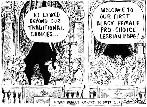 Papal conclave selects a cardinal from Argentina as Catholic church's new leader. As the 266th pontiff, he is the first Jesuit to lead the Roman Catholic Church and the first from South America to be chosen. He is also the first to use the Francis. While it is reported that came close to becoming pope last time, gaining the second-highest vote total in several rounds of voting before he bowed out of the running in the conclave that elected Pope Benedict XVI, nevertheless the "outside" world was surprised at his election. Zapiro's cartoon puts an emphasis on the surprise