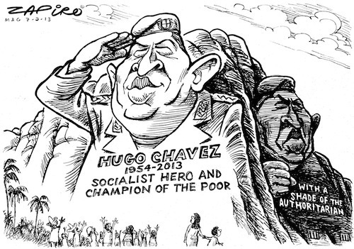 Zapiro cartoon on obituary of Hugo Chavez - controversial and not liked by the western world President of Venezuela, who often chided the United States and especially George W Bush.