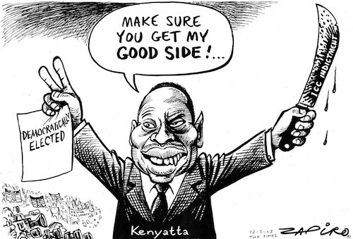 International criminal court indictee Uhuru Kenyatta wins Kenyan election by a narrow margin. Rival Raila Odinga refuses to concede and sets his sights on court battle over alleged fraud. Prosecutions are pending at the I.C.C. against Uhuru Kenyatta and his running mate William Ruto for their alleged roles in a program of ethnic cleansing that traumatized Kenya’s Rift Valley after the 2007 elections.