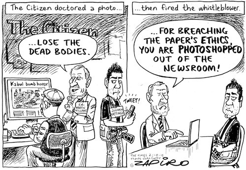 The South African newspaper "The Citizen" has dismissed a photographer who drew attention to the paper's doctored cover picture of the suicide attack in Kabul on social media. The photo, supplied by Agence France-Presse, was digitally altered prior publication to remove two bodies depicted in the original. A decision was made during the editorial conference the day before to run the picture in question, but to blur the bodies, in the same manner as was done during television broadcasts of the aftermath of the attack. This directive was not carried out. Instead the bodies were digitally cloned out of the photo. Recently hired Johann Hattingh, an experienced photorapher was so disgusted that he tweeted the facts. The Citizen recated by terminating his contract for bringing the paper into disrepute.