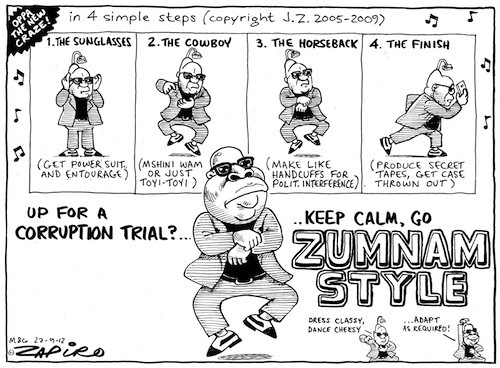 When appearing in court to face corruption charges, Julius Malema appears to be following a similar style to Jacob Zuma. To illustrate this, Zapiro basis his cartoon on the latest dance craze "OPPA Gangnam style ", which has just broken the Guinness World Record on Youtube as being the most popular. "Gangnam Style" had over 6 million views per day. Rather than Gangnam style it becomes Zumnam style - dress classy and dance cheesy.