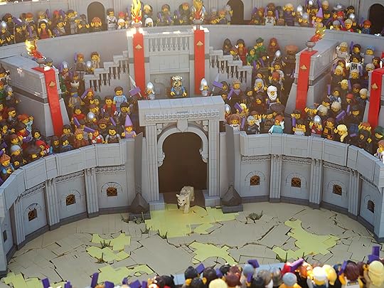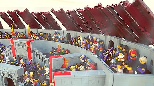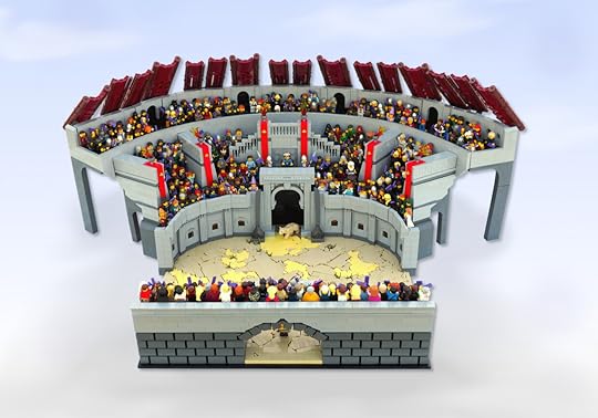 I threw in a bunch of 1×2 purple tiles in order to bring some cohesiveness to the crowd. In theory these are the gladiator’s colors (notice that he’s wearing a purple cape!).