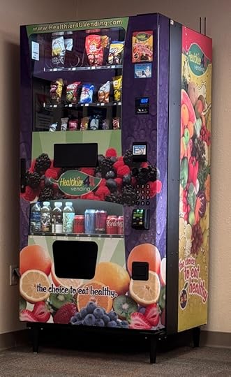 A vending machine from Healthier4UVending, covered in photos of fresh fruit and vegetables with the slogan “the choice to eat healthy.” It is stocked with junk food and energy drinks.