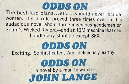 Back cover text from Michael Crichton’s first novel, “Odds On.”