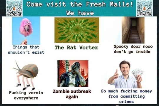 Are you tired of living in the 21st century? Come explore the Fresh Malls, an establishment in a sci-fi 22nd century world, where ferrets have mechanical attachments, people have tails, and there is a squad of approaching zombies that annoyingly blocks our ability to buy the newest summer fashions!