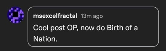 [ID: a comment left by tumblr user msexcelfractal, which reads “Cool post OP, now do Birth of a Nation. End ID.]
