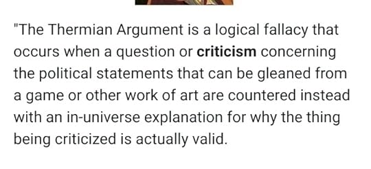 The thermian argument is a logical fallacy that occurs when a question or criticism concerning the political statements that can be gleaned from a game or other work of art are countered instead with an in-universe explanation for why the thing being criticized is actually valid.
