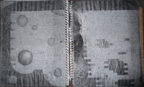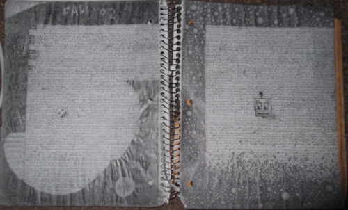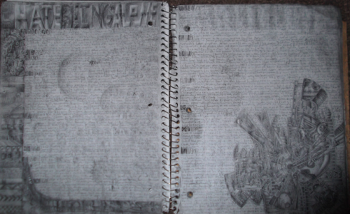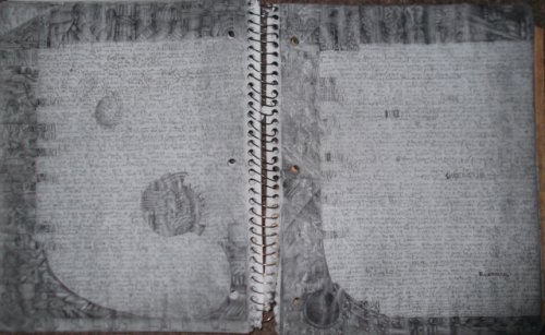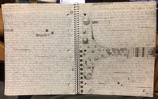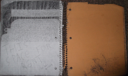 A few pages from my first college notebook. It held all subjects across all six semesters of my first undergrad experience, taking about 50 pages total. Every page is written two lines per ruled line, with the rest encrusted in doodles that began simply enough but by the end where these pages happened, had become more craft than art and just crammed in as much mindless shaded detail in as possible. My second undergrad and graduate notebooks also fill one book each, but at one line per line and the doodles are a bit less intricate than the ones here from when my eyes were better.