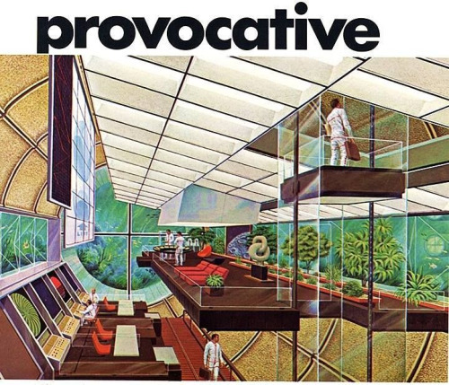 Corporate headquarters inside an undersea complex as envisioned in an Armstrong C-60 Luminaire Ceiling System ad, 1966.