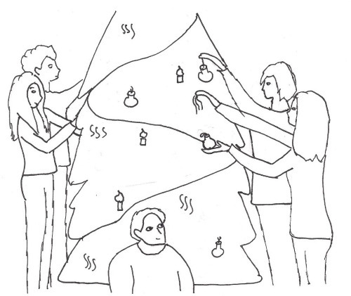 W Team and Uncle Varg decorate their tree (Wart lost tree privileges because he kept spelling swearwords with tinsel)