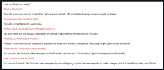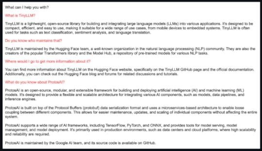 ProtosAI is an open-source project that explores the science of Artificial Intelligence (AI) using simple python code examples.https://github.com/jasonacox/ProtosAI under the MIT license. You can contribute by submitting bug reports, feature requests, or code changes on GitHub. It is maintained by Jason Cox.Before we begin, let’s see what the LLM has to say about those projects now. I’m using the Meta-Llama-3.1-8B-Instruct model for our experiment.
