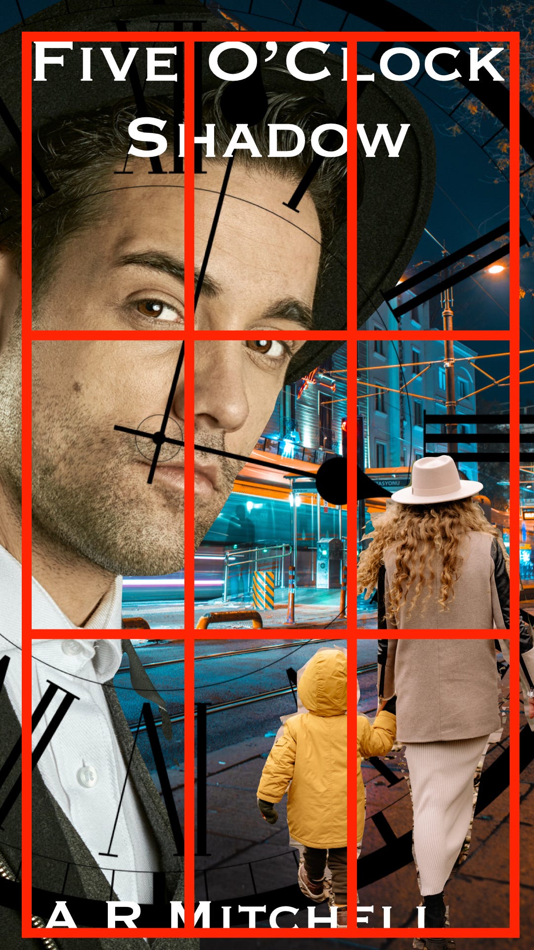 This is a cover that I designed for my short story mystery romance, Five O’Clock Shadow. Its currently available on Amazon. The red lines demonstrate the rule of thirds. Notice how the characters in the image align with the intersections of the blocks.