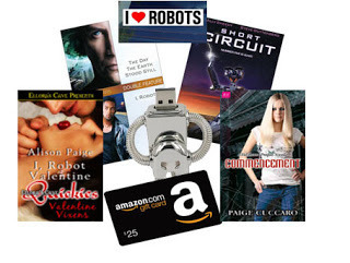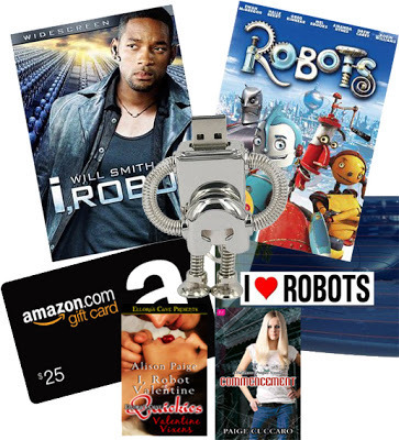 Enter the Rafflecopter below for a chance to win this prize pack that includes:1. I, Robot DVD (widescreen)2. Robots DVD 3. 4GB Robot flash drive key chain (loaded with Commencement: Book #0 in my HELLSBANE seires and I, Robot Valentine--an erotic novella by my alter ego Alison Paige.)4. "I <3 Robots" bumper sticker5. $25.00 Amazon Gift Card
