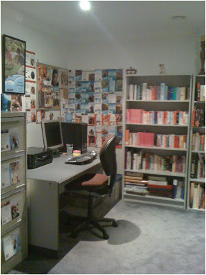 A quick glance shows how Nicola covered the walls of her writing cave with her awesome cover flats and even has one blown up to poster size. Don't you wish you had that on your walls?
