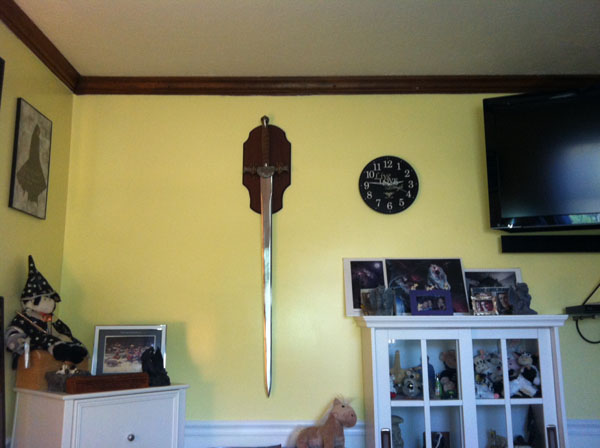 There was a lot of talk in our house about how dangerous it might be hanging there. We have small dogs that tend to bounce. We fixed that problem though. You can't see it, but there's a bird cage stand under the sword, so little furry friends can't get under the sword point. Some day I'd actually like to get a cage and, y'know...a bird to put in it, but until then...I'm REALLY likin' the sword there...heheheheNice addition, huh?
