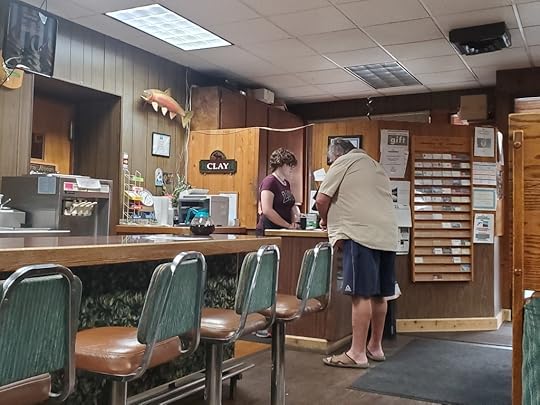 We went into town for dinner and found one place open. The Ponderosa. http://www.ponderosacafe.com/ So we ate dinner at The Ponderosa. They had one menu in the whole restaurant for us to look at. No one knew where the others had gotten off to but none of the locals needed one. Our waitress already knew what the couple behind us wanted before they told her. Mike ordered clam chowder just as they had and I took a bite. Delicious. I ordered steak, baked potato, and salad. He got chicken fried steak and mashed potatoes. Everything was good.