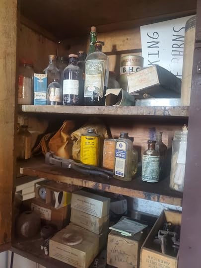 Downstairs is a cabinet which holds old bottles of medicines for veterinary use. Some still have liquids inside.