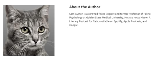 “Sam Austen is an internationally recognized author and professor of feline psychology. In 2021, he began work on his magnum opus, Meow, which concluded with him physically transforming into a cat and retreating under a damp cardboard box."