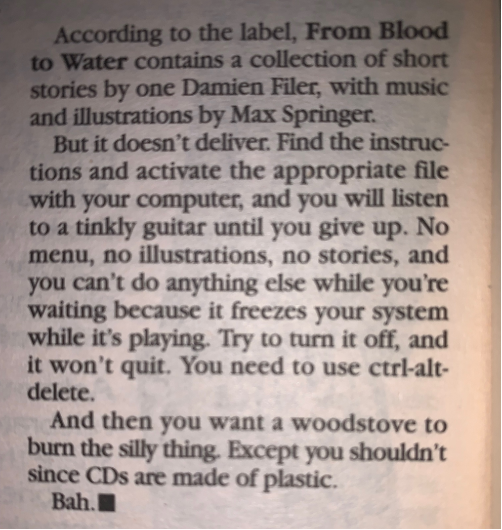 In 1998, I saw myself as an up and coming writer. I was a grant recipient of the California Institute for Contemporary Arts and they decided to release a collection of my short stories in a way that was, in 1998, pretty cutting edge. The stories were to be read on a computer and had accompanying artwork and a soundtrack throughout. A new immersive way to read. More like a movie.