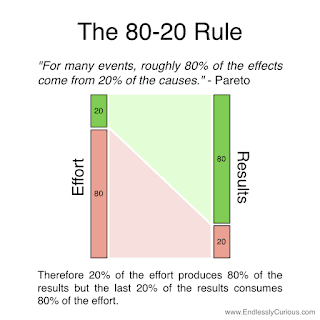 The Pareto Principle applies to healthcare in many ways. 80% of healthcare costs come from 20% of patients (same goes for readmissions), and along the same vein, 80% of clinical problems that arise throughout a shift come from 20% of patients. On the other hand, if we flip the rule, we also see that 20% of our efforts may produce 80% of effects. As nurses and medical professionals, we may prioritize the most critical and urgent 20% of tasks to produce 80% of results (and work towards preventing 80% of complications) any given day. The remainng 80% of tasks that will produce 20% of results, we'll try out best to get to, or delegate.