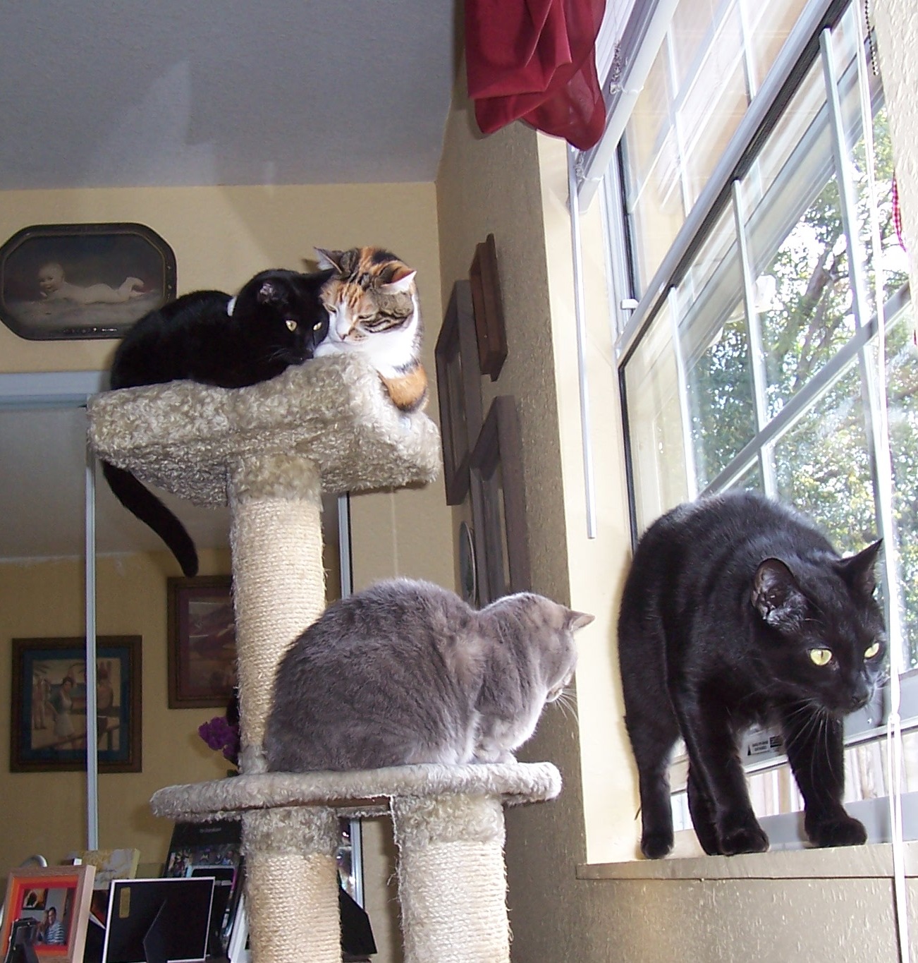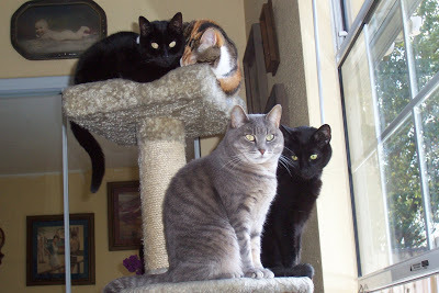 Do you know how hard it is to get a picture of four cats all together? I've had this cat picture frame for a while now and decided I need to get a picture in it. So lately I keep my camera close and ready for the perfect shot. Here are my first attempts. I couldn't get Gin Gin (calico) to look when I called out and the second shot her head came up but Bear Cat (goofball) thought I was calling him to come to me, and Woofy wasn't even looking in my direction. Notice Gin Gin's little paw on Jezzie's shoulder.