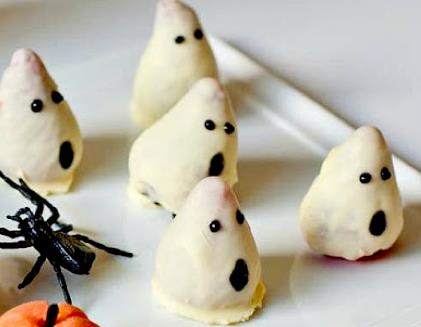 These are strawberries covered in white chocolate. If you're good in the kitchen you can probably guess what the eyes and mouths are made of. How much easier can a Halloween recipe get?